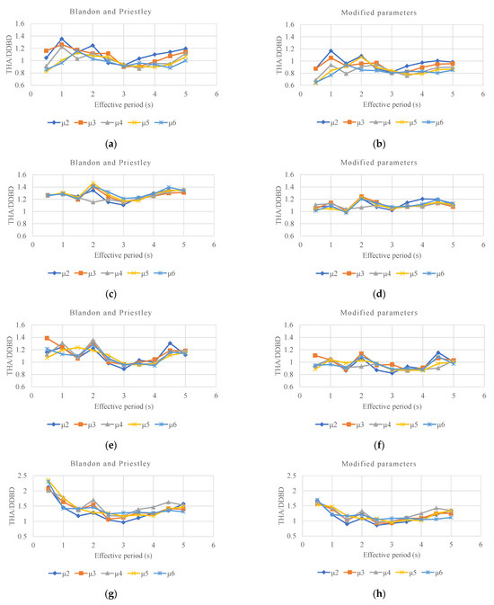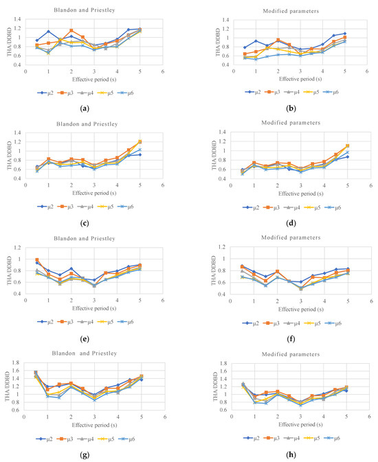 The results related to the elastic perfectly plastic hysteretic model presented in Figure 4a show, on average, high values for the DR with respect to the other hysteretic models, partially due to the post-yield stiffness ratio () [18]. For this model, the formulation proposed by Blandon and Priestley tends to provide DR values that are mostly higher than one for each ductility level and effective period. The DR trend for the bilinear model (Figure 4b) is quite uniform, especially for central periods (1.5–4 s) for all ductility levels. In the case of both Takeda models the trend is similar, with DR values of about 0.8 in the central region of periods (between 1.5 s and 3.5 s) and values larger than the unity outside this region. Between these two Takeda models, the Takeda “fat” provides larger values than the “narrow” outside the central region.