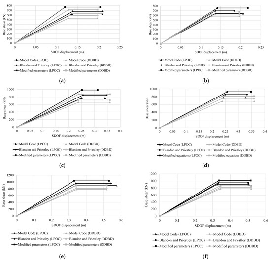 In Figure 9 the results related to the pushover analyses are presented, showing, in each case, the curves obtained for the structures designed with different equivalent viscous damping equations. In particular, the pushover curves are plotted in the base shear vs. equivalent SDOF displacement plane. For each considered frame, two graphs are reported. The first refers to the curves obtained using approach 1 (Figure 9a,c,e), with reference to the method for determining the damped spectra in the DDBD procedure, while the second has been obtained from the frames designed using approach 2 (Figure 9b,d,f).