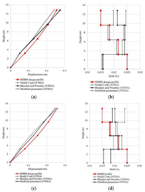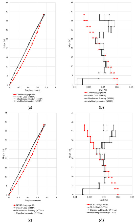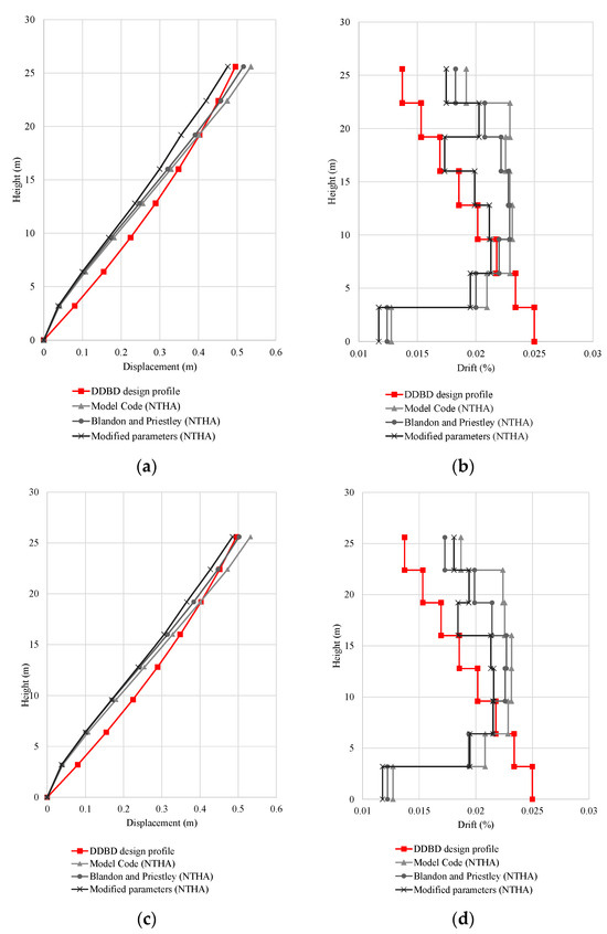 By observing the results shown in Figure 10a,b related to approach 1 for the four-storey frames, it can be noted how, by using the equations from the Model Code [46] and those by Blandon and Priestley [18], the displacement values in the first three storeys are lower than the ones provided by the DDBD procedure, contrary to the displacement value at the top level. By using the parameters proposed in this paper, a reduction in the top maximum displacement can, however, be noted. Concerning the inter-storey drifts, for the structures designed by using the damping equations from the literature, the drift values from NLTH are higher than those obtained from the DDBD design displacement profile at all storeys above the ground floor, but in all cases they are lower than the design value of 2.5%. Instead, by using the calibrated parameters to evaluate equivalent viscous damping, the drifts are lower than the ones obtained from the DDBD procedure for all the storeys, except for the top level.