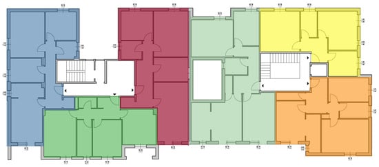 The building’s roof is flat, insulated, and accessible. The southeast and southwest sides have large openings (doors–windows) and balconies, while the northeast and northwest sides have fewer windows and no balconies. The windows are made of double glazing and wooden frames, with a total transparent surface of 600 m2; the average transmittance of the glazed window components is 2.98 W/(m2K).