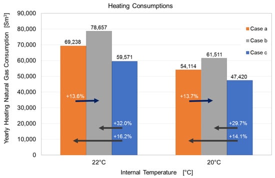 Figure 3 results, in terms of yearly natural gas consumption, are reported for all the scenarios and temperature settings. The percentages above the arrows represent the increment in the energy source consumption between two cases: the first one is individuated by the arrow start, while the second one is showed by the arrow end.