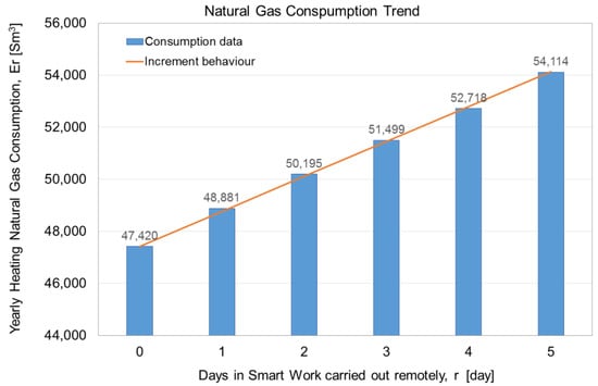 Equation (1) permits for the calculation of building consumption Er, given the r days of remote working, knowing the building consumption before the SW application E0, when r is equal to 0, and the coefficient k. It is worth observing that E can be expressed in different measure units, depending upon the employed energy source; in the case study example, it is expressed in Sm3/year. The k coefficient depends upon the considered building archetype and has, as measure units, the same measure unit of E0 divided by day. In the examined case for this kind of building, k is equal to 1343 Sm3/day.