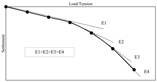 According to Sharma et al. [31], the elastic modulus of soil is an important characteristic in geotechnical projects, transportation engineering, engineering geology, and geotechnics. Load–settlement relationships are nonlinear [32,33]. This suggests that considering a constant elastic modulus independent of the stress level may underestimate the settlement, as demonstrated by the typical load–settlement curves obtained from a plate load test that showed a smaller elastic modulus as the transmitted stress increased (see Figure 1).