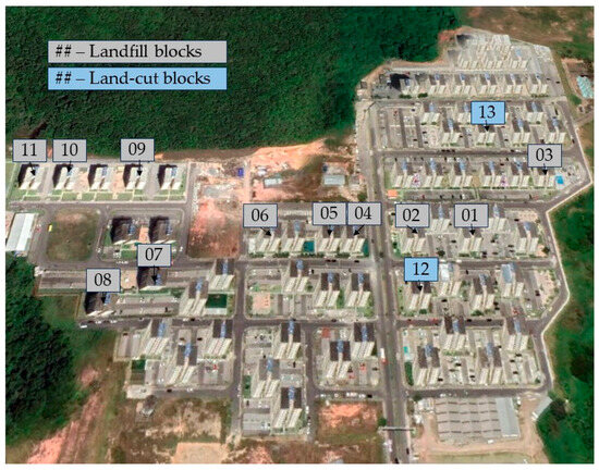 Thirteen of sixty-four apartment blocks in the city of São Lourenço da Mata (PE, Brazil) were analyzed. Eleven of the thirteen were built in landfill sections and two were built in land-cut sections. Figure 2 shows the project site. Each block had eight stories and 225 m2 of space. The building technique consisted of concrete walls over mat foundations. The mats had thicknesses of 0.35 m and surface-mounted areas of 262 m2.