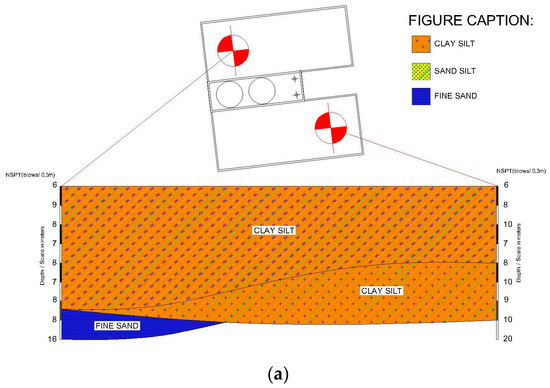 Figure 10 shows the geotechnical profile of the numerically investigated block. A profile with a silty-clay prevalence was identified, with an average NSPT of 10 blows in a compressible layer (NSPT > 30 blows) of around 3 m following earthworks (land-cut sections).