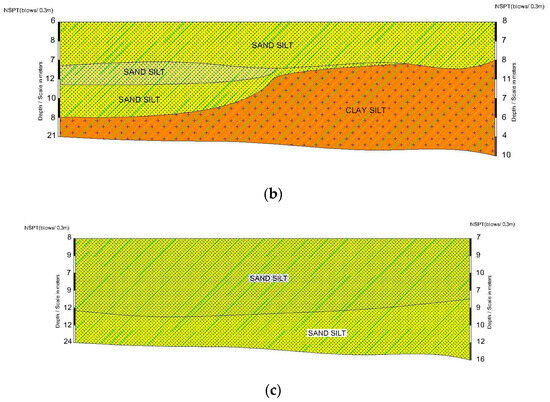 Typical soil profiles: (a) Building 2, (b) Building 4, and (c) Building 5.