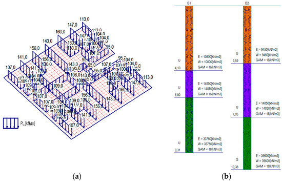 The finite element mesh that defines the radier was created, measuring 16.50 m in the X and Y axes. A constant interval of 0.5 m was used in the two X and Y axes, thus forming a finite element grid with 1134 nodes (Figure 4a). The modulus of elasticity of the radier (concrete) was adopted at 20,000 MPa and a Poisson’s coefficient of 0.15. After determining the representative mesh of the radier, the linear loads from the concrete walls were placed. The linear loads ranged from 77 to 176.4 kN/m (Figure 4a).