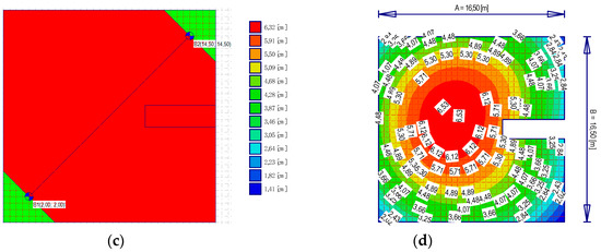 The option of inserting the parameters of the two boreholes was used and the location of the boreholes in relation to the studied radier was determined. The values of the modulus of elasticity, modulus of elasticity of recompression (W), and soil-specific weight (GAM) were assigned, as shown in Figure 4b. The method of interpolation of the properties of the inserted profiles was used to determine the geotechnical profile of the calculation (Figure 4c). The red color graphically represents the region where the profiles were interpolated. After that, the program was used to calculate the settlement of the model, obtaining the settlements as shown in Figure 4d.