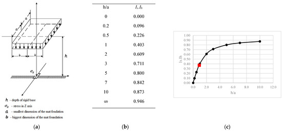 Parameters for obtaining corrective factors: (a) rigid depth dimension—h, (b) product of Is.Ih for b/a = 1 by Harr [17], and (c) interpolation process.
