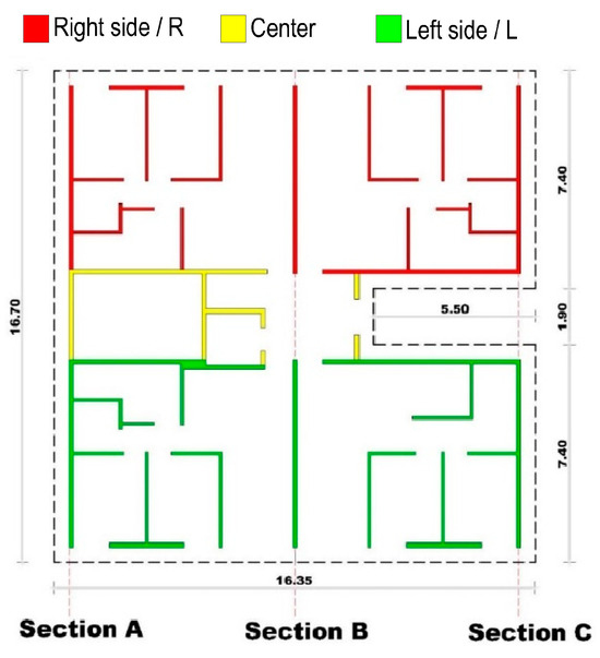 On each floor, the concrete walls were built in two phases, with the first consisting of the formworks of the left walls (L) and the center formworks (C). The right side (R) of the formwork was the second stage (see Figure 6). As a result, a standard approach for presenting the structural sequence of the building under consideration was created. It was assumed in this approach that the formworks for the first portion (L+C) were mounted in a day and cast on the same day. The formwork for the second part (R) was constructed the next day and cast later that day. Table 4 summarizes the steps of this constructive process, which was one source of the input data for the numerical modelling developed.