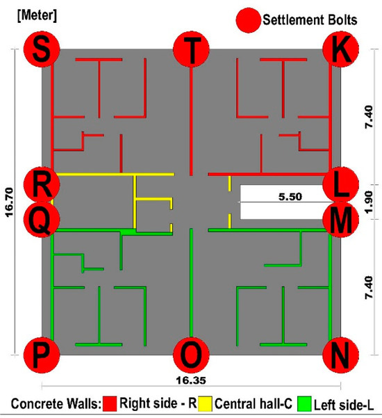 More recently, foundation measurements [37,38,39] and analyses of soil–structure interaction modelling [40,41] have been investigated. These investigations have often been focused on framed buildings or industrial slabs [42]. In view of the limited availability of research on the behavior of concrete-walled constructions laid on a concrete mat foundation, the research developed and reported in this article seeks to contribute to the design strategies for this type of structure with qualitative and quantitative information from the examination of a real case.