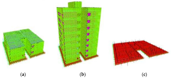 The construction process was numerically simulated using an SAP2000 module called staged construction. Staged construction is a static modeling, analysis, and design application that enables the definition of a sequence of construction stages in which structural systems and load patterns are added or removed and time-dependent behaviors are evaluated, including creep, shrinkage, and aging (change in elastic modulus and strengths with age). Material and geometric nonlinearity may be applied to staged construction. Further, staged construction may be part of a sequence of nonlinear static or direct-integration time-history analysis load cases. For linear load cases, the structural stiffness at a given construction stage may serve as the basis for analysis. Three different evaluation scenarios were investigated in the numerical modeling. The first scenario considered the modeling of construction stages as well as soil–structure interactions, and is referred to throughout the text as the acronym SSI-SC. In the second scenario, the modeling took into account the instantaneous application of the load in a single construction phase. In this scenario, the soil–structure interactions were also considered, but the effects of creep and shrinkage were not taken into consideration. This stage is referred to throughout the text as the acronym SSI-IL.