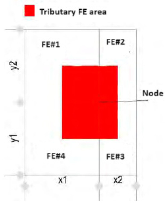 Once we had the volumetric coefficient of vertical reaction, the spring constants of translation and rotation were determined using tributary area concepts. Often, an assumption is made to calculate how much area of a plate can be attributed to a node or, in other words, the influence of each node on the surface area of a plate. It depends on the shape of the plate. For a perfect square or rectangular plate, each node will influence exactly ¼ of the plate’s surface area. But for a generalized quadrilateral, the best practice would be to calculate the center of the mass of the plate and then draw lines from that center point to the middle points of each side. The described tributary area calculation was the key procedure used internally by the commercial software to determine the linear spring constant. Figure 11 shows a generic tributary area of a finite element of the foundation plate slab.