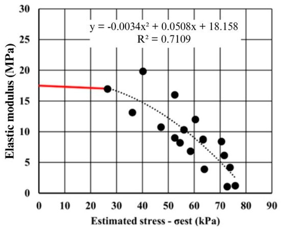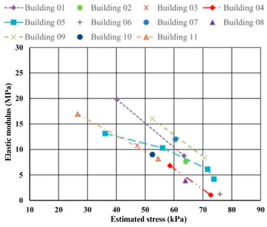 Figure 15 shows the elastic modulus versus the predicted stress curves for a mat foundation built over land-cut sections. The back-analyzed values of the soil elastic modulus decreased from 20.3 MPa to 17.4 MPa for Building 12, as well as from 19.4 MPa to 15.4 MPa for Building 13. The use of a constant elastic modulus for settlement predictions in the context of mat foundations over cuttings has demonstrated efficacy, as evidenced by minimal observed variation. This approach is particularly notable given the considerable heterogeneity documented in the literature regarding soil elastic moduli [17,26]. Notably, in the context of cut sections of land, this heterogeneity leads to pre-consolidation stresses, with the applied stress increments remaining below 80 kPa.