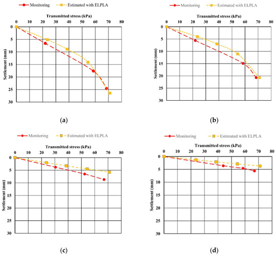 Figure 16 shows the measured and estimated settlement with ELPLA software for Buildings 1 and 2 (landfill sections—Figure 16a,b) and Buildings 12 and 13 (land-cut sections—Figure 16c,d). The FRM specified in Table 6 was used for landfill-section buildings, whereas the constant elastic modulus was used for land-cut sections. The use of the FRM in the prediction of settlement in landfill sections, with the ELPLA technique for settlement monitoring, is recommended.