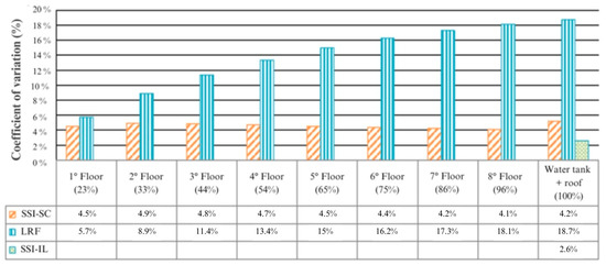 Table 9 shows the data for the SSI-SC, SSI-IL, and LRF models. When compared to the LRF model, the SSI-SC model exhibited less variance between the minimum and maximum settlement, with the CV ranging from 4.07% to 5.20% for the SSI-SC model and 5.72% to 18.70% for the LRF model.