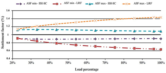 Figure 18 exhibits the absolute settlement factor variations for the SSI-SC and LRF models. It demonstrates that the ASF for the SSI-SC model tended to have stable maximum and minimum values, but in the LRF model, the maximum factors tended to grow and the minimum factors tended to decline.