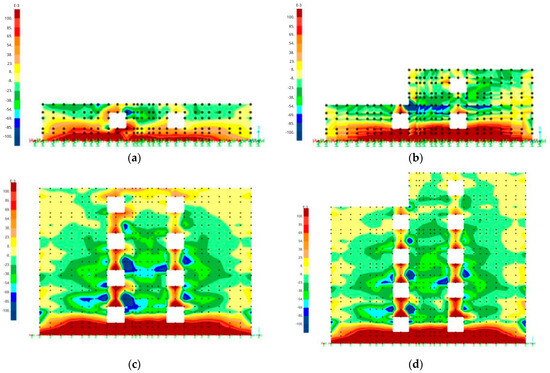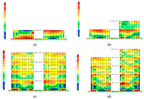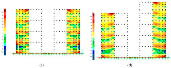 Figure 20a–d show the maximum stress analysis in Section B for Stages 4, 5, 9, and 10, respectively. In Stage 4, the normal maximum compression stress occurred at the base of the walls on the right side, while normal tensile stress arose at the base of the walls on the left side. The highest normal tensile stress developed on the opposite side with the partial execution of the upper floor, corresponding to Stage 5 and demonstrating the foundation’s lifting tendency. Normal maximum stresses at the base of the walls did not tend to shift position or direction (tension and compression) when Stages 9 and 10 were examined. There was an increase in the normal stresses in the walls on the floors below the wall and in the region opposite the wall, indicating load redistribution due to the stiffness of the structure. The SSI investigation of the construction stages affected the distribution of loads on various walls, an issue that is often overlooked in current concrete-walled construction projects. The observed behavior emphasizes the importance of considering the loads imposed on structures as a result of their construction process.