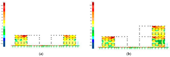 Figure 19a–d exhibit the maximum stress at Section A for Stages 4, 5, 9, and 10, respectively. The highest stress was found to be more concentrated close to the base of the walls on the right side in Stage 4. Normal maximum stress occurred on the opposite side to that observed without the complete execution of the upper floor, corresponding to Stage 5. When Stages 9 and 10 were examined, it was found that the maximum normal stress in the base of the walls did not tend to shift position. Normal stresses on the walls increased on the levels below the wall and in the region opposite the wall, illustrating the redistribution of stresses caused by the structure’s stiffness.