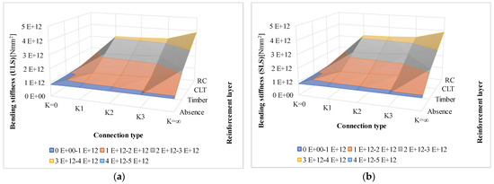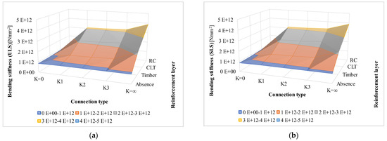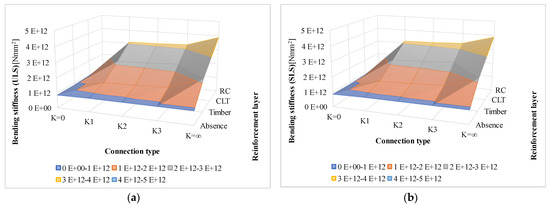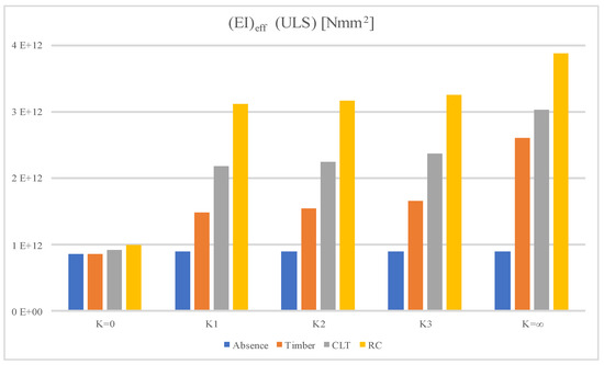 The SLS bending stiffness in Figure 5b shows a greater increment, with a range from 73% (K1) to 92% (K3) in the case of crossed timber planking, from 153% (K1) to 177% (K3) in case of CLT panel, and from 255% (K1) to 272% (K3) for the RC slab.
