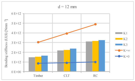 The ULS bending stiffness in Figure 5a for the composite section with 12 mm diameter screws increases from 66% (K1) to 85% (K3) with the double-crossed timber planks system, from 145% (K1) to 165% (K3) with the homogeneous beech CLT panel, and from 250% (K1) to 264% (K3) with the RC slab.