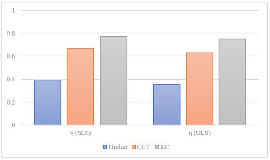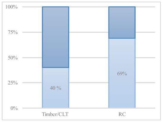 Regarding the composite system, the additional reinforcing element constitutes about the 40% of the structural permanent loads in the two timber-based solutions, and about the 69% in the case of the RC slab, see Figure 8.