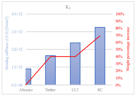 The SLS bending stiffness in Figure 4b shows a greater increment, with a range from 69% (K1) to 90% (K3) in case of crossed timber planking, from 149% (K1) to 172% (K3) in case of CLT panel, and from 252% (K1) to 268% (K3) for of RC slab.