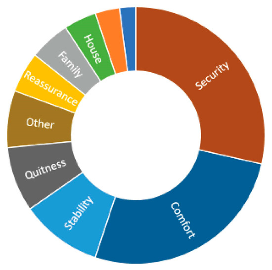 To contextualize these linguistic insights in contemporary settings, a survey directly involving 112 participants from Eastern Bakaa Valley in general, and 27 dwelling owners, was conducted in our study. This survey, comprising 25 questions about “Maskan”, delved into various aspects of dwelling spaces, including their importance, meaning, essentials, location, and deficiencies. Notably, when asked about the meaning of “Maskan”, the predominant responses were security and comfort, followed by stability, warmth, family, reassurance, calm, house, and quietness (Figure 2).