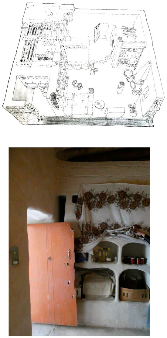 On the top is an interior articulation of a traditional dwelling. On the bottom, these are the interior space articulations designed by locals to store food during dry hot summers, and cold winters. Source: Top by Ragette [12]; bottom by Author (2018).