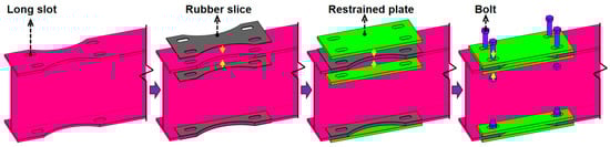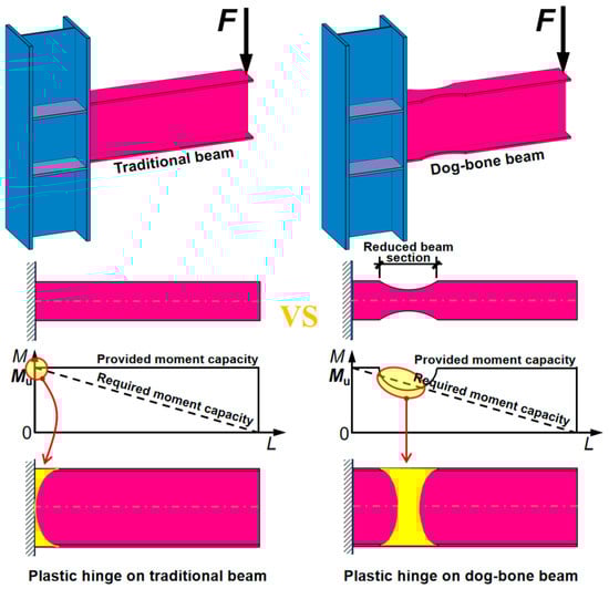 - In order to give full play to the plastic deformation capacity of the dog-bone beam section, it was necessary to pay close attention to the construction quality of the proposed innovative steel moment connection. On the one hand, the welding quality of the steel beam and the end plate should be improved to prevent weld fractures [38]. On the other hand, the radius cutting and the long slot opening of the dog-bone beam section should be smooth to prevent stress concentration under loading [17]. In addition, the influence of the fixed point position and slot size on the hysteretic performance of the proposed connection should be further studied.