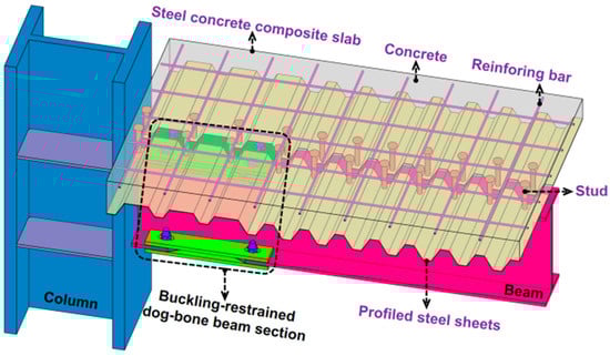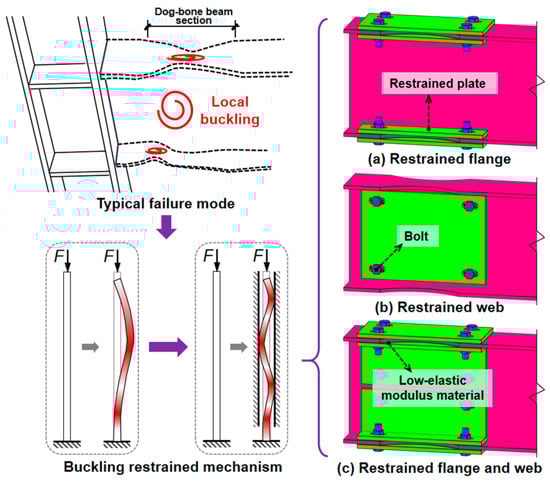 - Liu, C.; Wu, J.; Xie, L. Seismic performance of buckling-restrained reduced beam section connection for steel frames. J. Constr. Steel Res. 2021, 181, 106622. [Google Scholar] [CrossRef]