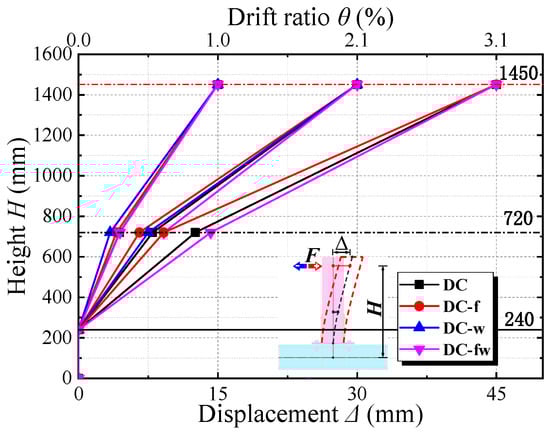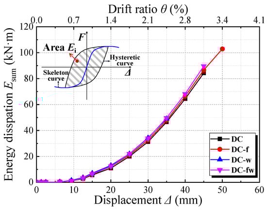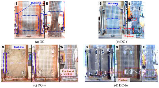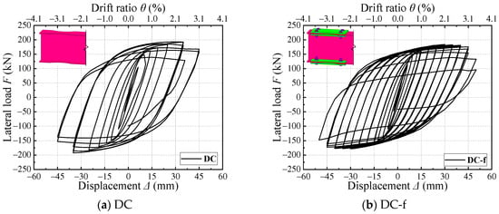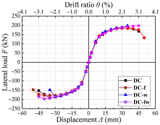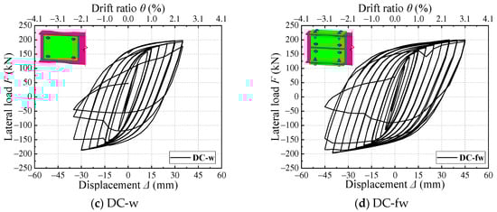 - The initial yield area of all the specimens occurred in the dog-bone beam section during the testing process, indicating that the arrangement of the buckling-restrained steel plates did not affect the outward movement of the plastic hinge from the beam–column joint core area. According to the failure modes of the specimens, the arrangement of restrained steel plates could effectively restrain the local buckling of the dog-bone beam section and was conducive to the out-of-plane stability of the steel beam.