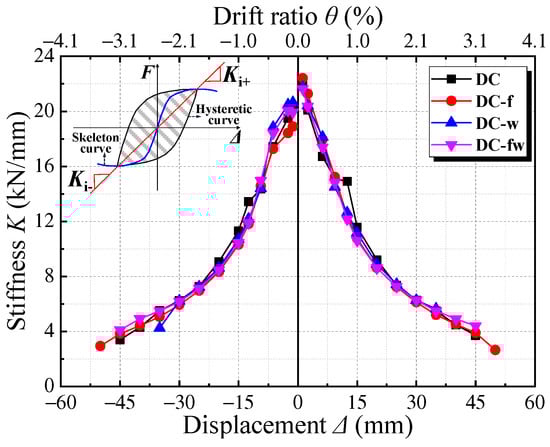 - The additional restrained steel plates in the dog-bone beam section had little influence on the bearing capacity and initial stiffness of the specimens, which were less than 6.00% and 3.00%, respectively. However, compared with the control specimen, the stiffness degradations of the restrained specimens were significantly reduced after the drift ratio of 1.70% was reached. Moreover, compared with the arrangement of restrained steel plates only on the web or both on the flange and web of the dog-bone beam section, the arrangement of restrained steel plates only on the flange caused a more obvious improvement in the deformation capacity and energy dissipation capacity of the connection, which were improved by 21% and 16%, respectively. This proved the validity of the proposed improvement method of the traditional steel moment connection with a dog-bone beam section in this paper.