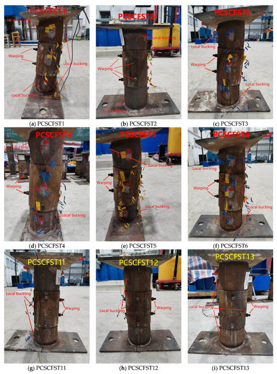 The experimental results reveal that specimen failure can be categorized into two main types. The first involves local buckling, characterized by steel tube buckling and concrete crushing. The second type is overall bending, where the specimen loses stability without significant local failure. These phenomena are evident in both short columns (slenderness ratio of 13) and long columns (slenderness ratio of 64), with the failure modes grouped accordingly, as shown in Figure 6. Notably, no significant damage to the external steel sleeve was observed in any of the tests, underscoring the bolts’ effective load transmission through the internal concrete. This transmission mechanism reduces the load on the external sleeve, maintaining its structural integrity and restraining capacity. The specimens marked in yellow in Figure 6 represent the axial compression specimens used for comparative analysis.