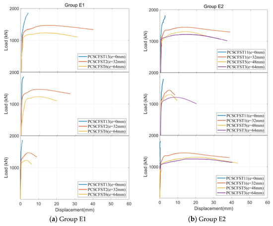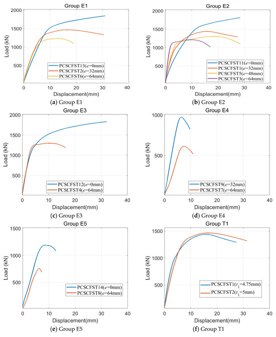 Figure 7 displays the load–axial compression curves for different parameter-controlled specimen groups. In the short-column groups E1–E3 (Figure 7a–c), the eccentricity initially had little impact on stiffness, with no clear pattern in loading stiffness. However, specimens with a greater eccentricity yielded earlier as the load increased. For groups E4–E5, those with a higher eccentricity showed lower initial stiffness and yielded sooner than those with lower eccentricity.