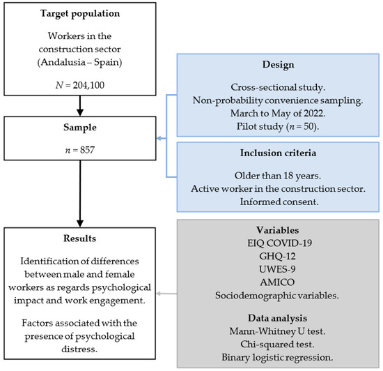 A cross-sectional descriptive study using online questionnaires was carried out. The study population comprised workers in the construction sector in the autonomous region of Andalusia, Spain. The government was interested in understanding the situation of the construction sector and any differences in its workers based on sex. Thus, the research team worked in collaboration with the Andalusian Observatory of Occupational Diseases of the Andalusian Institute for the Prevention of Occupational Risks [29].