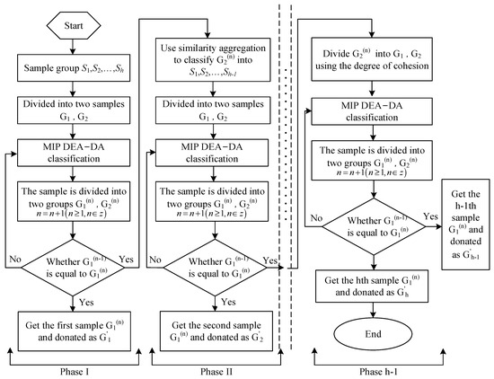 Based on the above theorems and definitions, the DEA–DA cyclic model of a partial binary tree is formed, as shown in Figure 3. First, decision-making members were categorized on the basis of subjective characterization into . The corresponding sample sizes in each category are . The first stage of classification is as follows: denote by , merge , and denote the new set formed by the merger by . The MIP DEA–DA model was applied to perform an initial discriminative categorization of and , resulting in two categories and . Compare whether the elements in , and , are the same. If they are the same, the model is stable, and there is no need to classify them again, ending the loop. If they are not the same, discriminate and classify and again according to the MIP DEA–DA model until the loop stops when the result after n classifications is the same as the previous one, i.e., , . The final then ends up in the first category, with the final result denoted as . The number of elements in is denoted by in . In the formed , if , it means that represents and reflects the main properties of . Accordingly, let and be part in , i.e., the part separated from , then the degree of aggregation of the elements with the categories is calculated, and the separated elements are assigned to , and thus a new classification is formed, which leads to a further second stage of discrimination and categorization.