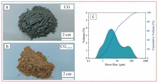 The CG was gray before being calcined (Figure 1a), and the CG700°C became red as it contained iron oxides during the calcination (Figure 1b). The particle size distributions of CG700°C were shown in Figure 1c, with a d50 particle size of 5.59 μm.