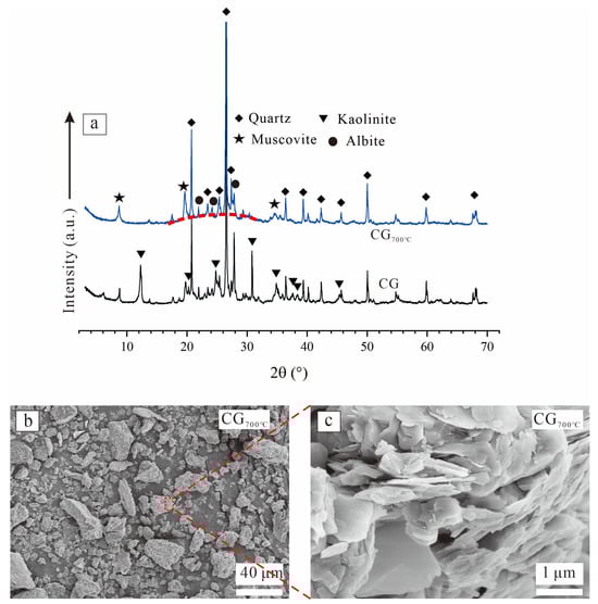 The XRD patterns of the samples denoted as CG and CG700°C were displayed in Figure 2a. The peak at approximately 26.3° (2θ) signified the existence of quartz, and the peak at approximately 12.3° (2θ) corresponded to kaolinite. Moreover, traces of muscovite and albite were contained in CG. After calcination, the reflections corresponding to kaolinite disappeared, and the spectrum of CG700°C featured a broad diffraction band centered at ~23.7° (2θ), indicating that the kaolinite had been transformed into an amorphous phase. However, the quartz existed in the CG700°C owing to its thermal stability. The SEM image of CG700°C is shown in Figure 2b,c. The SEM images at low magnification showed that CG700°C possessed irregular particles and a loose surface morphology (Figure 2b), and the SEM images at high magnification showed that the microstructure of CG700°C displayed a lamella shape (Figure 2c).