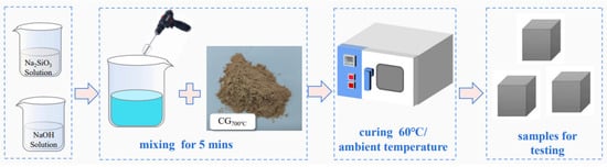 Preparation process. First, NaOH was added to distilled water to prepare a NaOH solution, which was then mixed with a Na2SiO3 solution to form an alkali activator. Second, CG700°C was blended with the alkali activators to produce a homogeneous gel slurry, which was forged into silica molds measuring 20 mm × 20 mm × 20 mm. Subsequently, a thin polyethylene film was applied to shield the slurry from water evaporation. The resulting specimens were then subjected to curing in a controlled environment at 60 °C for 24 h, followed by demolding and further curing at ambient temperature (~25 °C) for varying periods (3, 7, and 28 days) before testing.