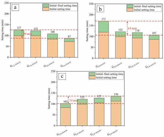 Setting times of geopolymers: (a) GX-10-0.55, (b) G2.0-Y-0.55, and (c) G2.0-10-Z.