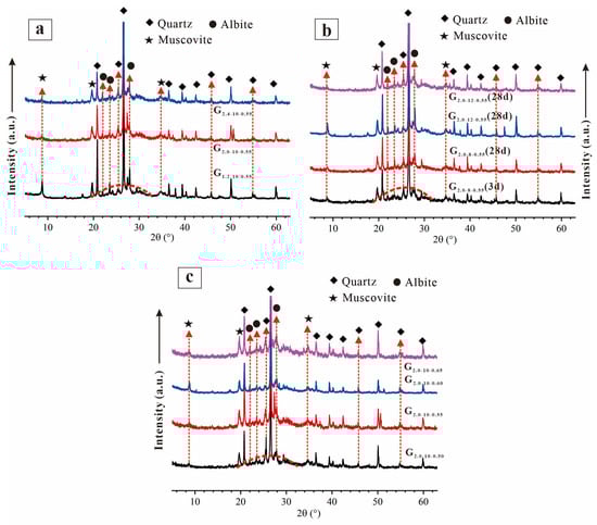 XRD patterns of geopolymers: (a) GX-10-0.55, (b) G2.0-Y-0.55, and (c) G2.0-10-Z.