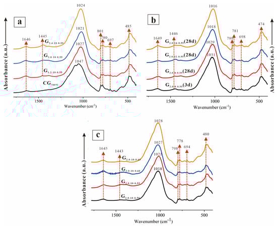 FTIR spectra of geopolymers: (a) GX-10-0.55, (b) G2.0-Y-0.55, and (c) G2.0-10-Z.