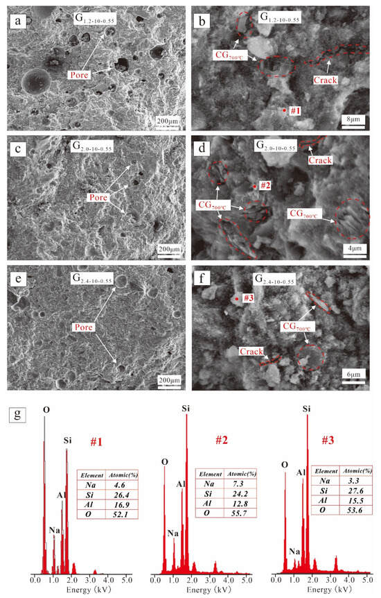 Figure 8, Figure 9 and Figure 10 displays the SEM/EDX results of selected geopolymers. The microstructures of geopolymers with different Na2SiO3/NaOH mass ratios are shown in Figure 8a–g. The low-magnification SEM images (Figure 8a,c,e) showed that many pores existed in the CG700°C-based geopolymers. The high-magnification SEM images of the geopolymers revealed that the matrix featured some isolated particles and microcracks within the matrix of the geopolymers (Figure 8b,d,f), which contributed to the compressive strength.