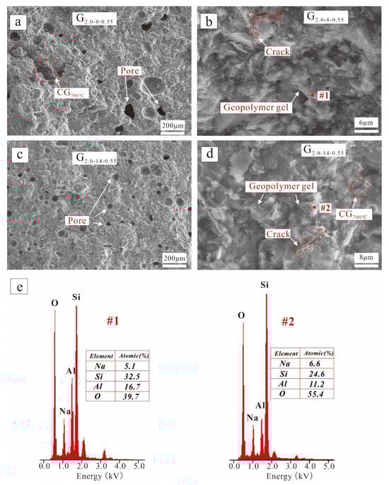 SEM images of geopolymers: (a,b) G2.0-8-0.55, (c,d) G2.0-14-0.55, and (e) EDX results of spots highlighted in images (b,d).