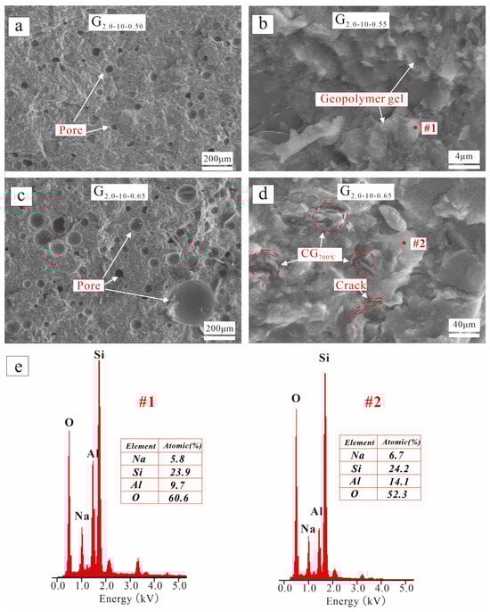 SEM images of geopolymers: (a,b) G2.0-10-0.50, (c,d) G2.0-10-0.65, and (e) EDX results of spots highlighted in images (b,d).
