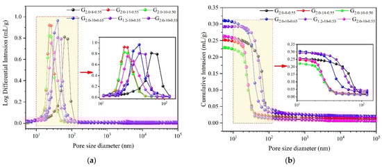 MIP results of geopolymers: (a) log differential intrusion; (b) cumulative intrusion.