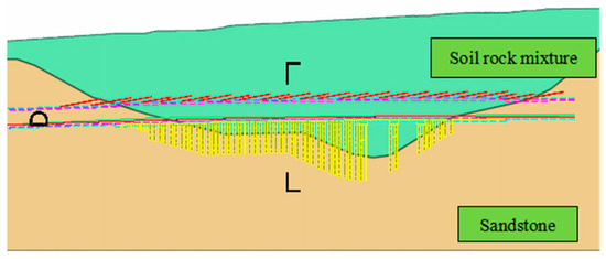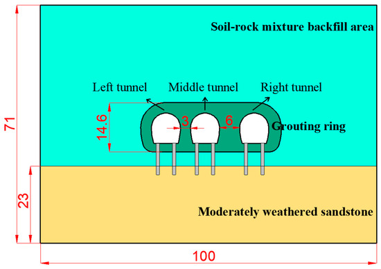 The research site is located in the deep soil–rock mixed backfill area of Chongqing Rail Transit Line 10, with an overlying thickness ranging from 11.5 to 56.0 m. The most dangerous section is a three-line tunnel, and the minimum spacing is only 3 m. Given the poor tunnel conditions, a series of precautionary measures were implemented to ensure project safety, including: ① preliminary curtain grouting; ② installation of tunnel piles to bolster the tunnel infrastructure. The profile view is illustrated in Figure 1, while a representative cross-section is delineated in Figure 2.