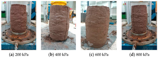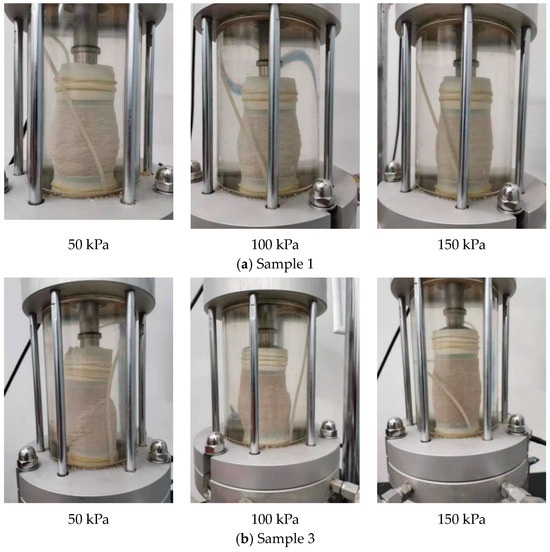 Sample 1 was finally selected as the similar material of the soil–rock mixture, and sample 3 was selected as the similar material of grouting mixture. The failure mode of the sample is shown in Figure 10. It can be seen that the deformation of sample 1 under the triaxial compression test resembled a “drum shape”, showing the same failure mode as that of the soil–rock mixture prototype. When subjected to a confining pressure of 50 kPa, sample 3 displayed an obvious 45-degree shear plane, and the failure mode was similar to the brittle failure of rock. When subjected to a confining pressure of 150 kPa, sample 3 did not exhibit obvious failure point, which was similar to the failure mode of soil. On the whole, sample 3 presented a failure mode similar to that of grouting mixture obtained by Hu [18].
