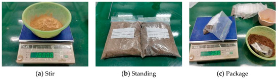 In this paper, coarse quartz sand within 1~2 mm particle size and fine quartz sand within 0.5~1 mm particle size were used to simulate the coarse-grain phase in the prototype of soil–rock mixture, and fine sand within 0.1~0.2 mm particle size was used to simulate the fine-grain phase, and clay was selected as the cementing material. To maintain a rock content of 40% to 60% in similarity material, the mass ratio of coarse quartz sand and fine quartz sand needed to be controlled within the 40% to 60% range. Furthermore, the method of increasing the proportion of cementing material (clay) was used to simulate the grouting mixture. Through the above methods, three distinct samples were set, as shown in Table 3, and the configuration process is shown in Figure 7.